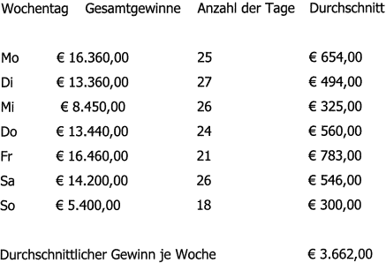 Wochentag | Gesamtgewinne | Anzahl der Tage | Durchschnitt |