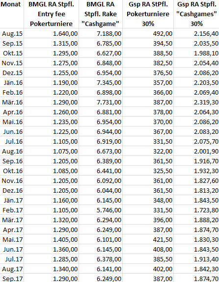 5. über die Beschwerde vom 17.05.2018 gegen die Bescheide des Finanzamtes für Gebühren, Verkehrsteuern und Glücksspiel gemäß § 201 BAO vom 17.04.2017 betreffend Festsetzung der Glücksspielabgaben für Kartenpokerspiele in Form von Turnieren und Cashgames gemäß § 57 Abs. 1 GSpG für die Zeiträume August 2015, September 2015, Oktober 2015, November 2015, Dezember 2015, Jänner 2016, Februar 2016, März 2016, April 2016, Mai 2016, Juni 2016, Juli 2016, August 2016, September 2016, Oktober 2016, November 2016, Dezember 2016, Jänner 2017, Februar 2017, März 2017, April 2017, Mai 2017, Juni 2017, Juli 2017, August 2017, September 2017