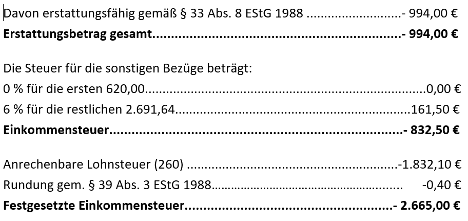 Für das beschwerdegegenständliche Jahr 2019 ergibt sich bei Berücksichtigung des nicht indexierten Familienbonus Plus und des nicht indexierten (erstattungsfähigen) Alleinverdienerabsetzbetrages eine Erhöhung der Einkommensteuergutschrift um 597 € auf 2.665,00 € (nach Berücksichtigung der anrechenbaren Lohnsteuer).