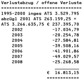 Mit Bescheid vom 22. November 2010 wurde für das Jahr 2009 die Einkommensteuer mit € 22.794,01 festgesetzt. In der Begründung wurde der Verlustabzug/offene Verluste wie folgt dargestellt: