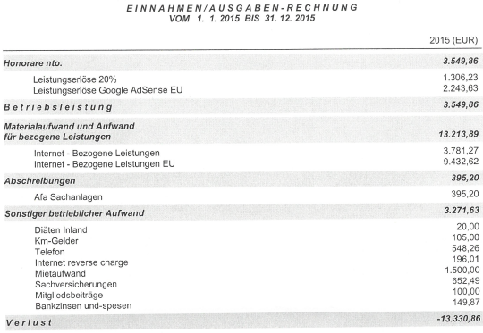 lnseratkosten je Inserat 15,- abzüglich Mwst= 12,50; 12,50 x7 Inserate täglich= 87,50; 87,50 x 30 Tage=2625; 2625 x 12 Monate = 31500,-