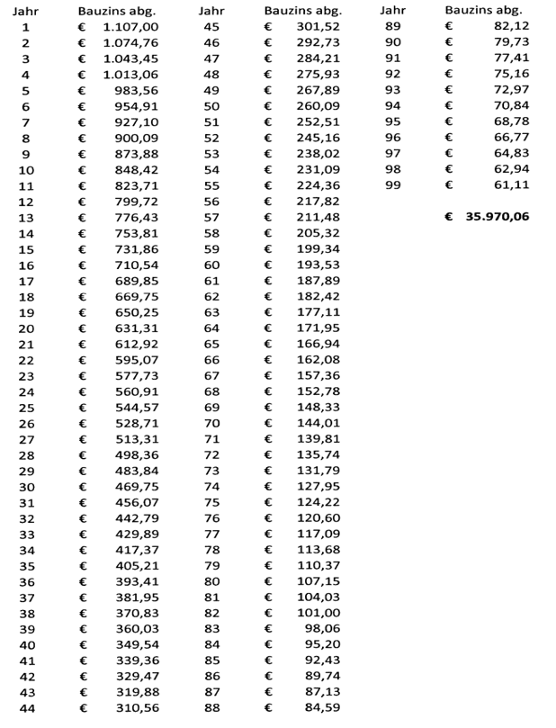 Ausgehend von den Prämissen: angemessener Baurechtszins jährlich € 1.107,00, Dauer 99 Jahre, angemessener Abzinsungszinssatz 3 %, bemisst sich daher der gemeine Wert als Summe der abgezinsten Beträge über die gesamte Laufzeit des Baurechtes wie folgt: