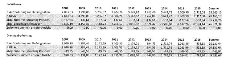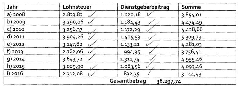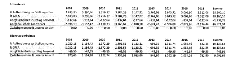 Vor Prüfungsbeginn wurden für 2013 überhauptkeine lohnabhängigen Abgaben gemeldet und für die Tatzeiträume der Jahre 2014 bis 2016 lediglich ein Gesamtbetrag von € 356,93 an Dienstgeberbeiträgen einbekannt. Dem stehen die Nachforderungen von € 11.287,87 an Lohnsteuer und € 4.073,35 an Dienstgeberbeiträgen gegenüber.