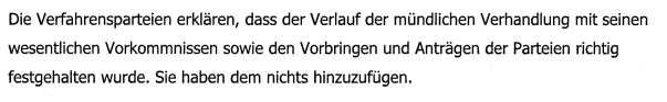 wurde von den Parteien unterschrieben und im Anschluss an die mündliche Verhandlung ausgehändigt.
