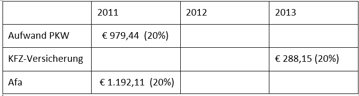 Aus diesem Grund, so die Behörde, werde daher der aus der Nutzung des betrieblichen Fahrzeuges entstandene Vorteil in Höhe der gesamten Kfz-Kosten (2011: € 12.551,25; 2012: € 5.922,62 und 2013: € 4.863,29) als sonstige Vergütung den Lohnnebenkosten unterworfen. Für das Jahr 2011 werde der anerkannte Privatanteil von 20% der Afa abgezogen.