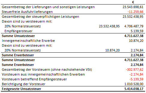Die Bemessungsgrundlagen und die Höhe der festgesetzten Umsatzsteuer für das Jahr 2020 betragen: