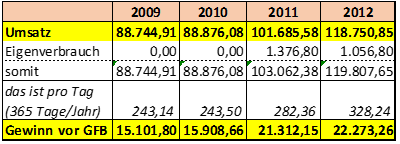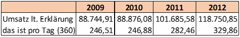 Auch wenn dieses Lokal von der Bf. wiederholt als "Tages-Café" bezeichnet wurde, war es doch sieben Tage die Woche täglich durchgehend an die 13 Stunden geöffnet. Von der Bf. selbst wurden die erzielten Tagesumsätze mit Beträgen zwischen etwa netto EUR 250 (2009) und EUR 330 (2012) erklärt.