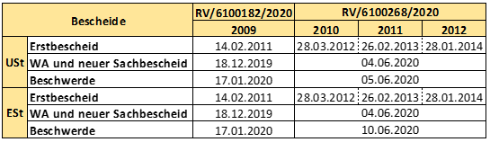 Mit 4. Juni 2020 ergingen Bescheide, mit denen die Umsatz- und Einkommensteuerverfahren 2010 bis 2012 wiederaufgenommen und in der Folge diese Abgaben neu festgesetzt wurden.