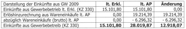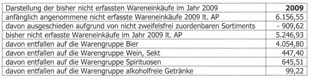 Betreffend dem Veranlagungsjahr 2009 wurden anfänglich nicht erklärte Wareneinkäufe in Höhe von netto € 6.156,55 angenommen. Davon wurden im Zuge der Außenprüfung Wareneinkäufe aufgrund von nicht zweifelsfrei zuordenbaren Sortiments in Höhe von netto € 909,62 ausgeschieden, sodass dies zu einem ungeklärten Wareneinkauf in Höhe von € 5.246,93 führt.