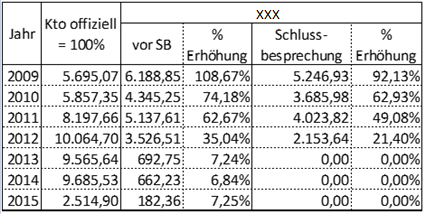 Die daraus erzielten Umsätze wurden entsprechend dem durchschnittlichen RAK laut Buchhaltung 2009 bis 2015 im Zuge der Außenprüfung wie folgt ermittelt: