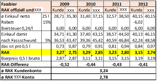 Da dies in der mündlichen Verhandlung unwidersprochen blieb (vgl. Punkt 1.4/a), folgt der Senat dem Einwand der Bf. im Hinblick auf einen verminderten Rohaufschlag bzw. Rohaufschlagskoeffizienten vollinhaltlich. Aufgrund der schlechteren Konditionen für anonyme Einkäufe reduziert sich dieser, wird aber aufgrund der bislang unberücksichtigten Biersteuer bei Bier weiterhin - fast unverändert - mit durchschnittlich RAK 3,23 angesetzt.