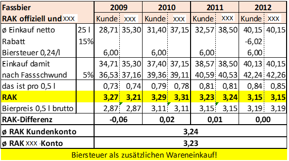 Zusätzlich ist der Wareneinsatz für Bier um die Biersteuer von EUR ***0,##*** pro Liter zu erhöhen. Diese Biersteuer wird bei Fassbier mit den anonym erworbenen Litern angesetzt und beträgt: