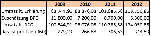 Die vom Bundesfinanzgericht im Schätzungswege (siehe unten) ermittelten durchschnittlichen Tagesumsätze überschreiten diese Bandbreite nur im Jahr 2012 marginal und bewegen sich in den anderen Jahren immer unter dem selbst erklärten und damit ohne jeden Zweifel erzielbaren durchschnittlichen Tagesumsatz 2012.