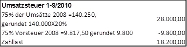 Im Nachschauzeitraum Jänner bis September 2010 erfolgt ein Ansatz der Umsatzsteuerbemessungsgrundlagen aliquot in Höhe von 75% der geschätzten Grundlagen der Vorjahre, somit Umsätze in Höhe von EUR 44.000,00 und Vorsteuer von EUR 3.100,00 (jeweils gerundet).