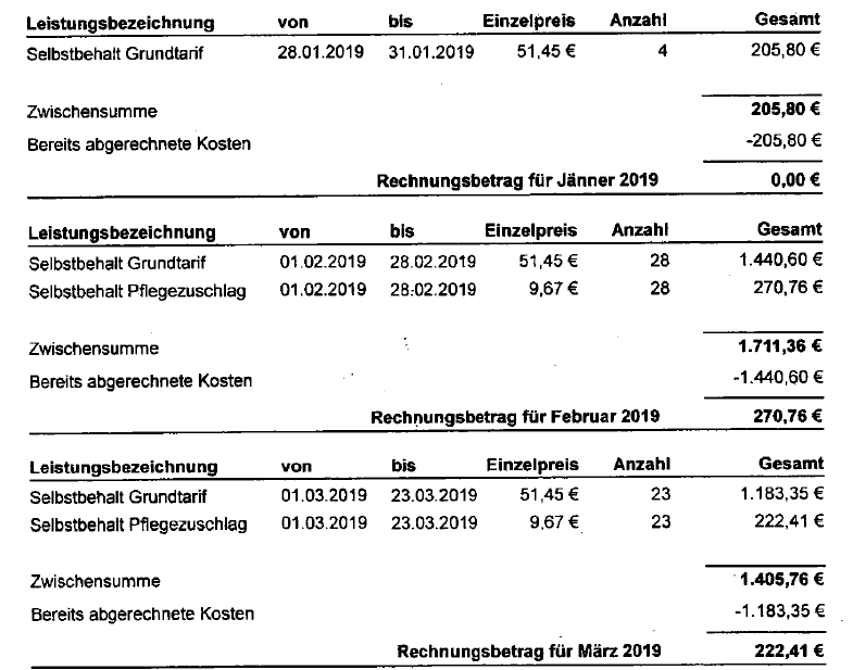 Die Beschwerdeführerin legte fristgerecht eine Aufstellung der außergewöhnlichen Belastungen sowie die entsprechenden Belege vor. Neben Rechnungen für Ärzte, Ambulatorien, Apotheken und Heilbehelfe legte die Beschwerdeführerin folgende Abrechnung einer Pflege- und Betreuungseinrichtung vor: