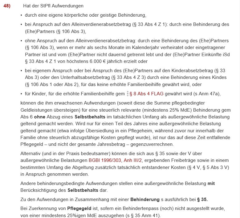 - Mehraufwendungen aus dem Titel der Behinderung, wenn die Voraussetzungen des § 35 Abs. 1 vorliegen, soweit sie die Summe pflegebedingter Geldleistungen (Pflegegeld, Pflegezulage, Blindengeld oder Blindenzulage) übersteigen.