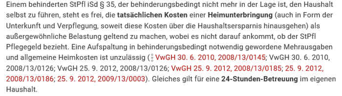 Aus der Bestimmung des § 35 EStG 1988 ergibt sich, dass aus dem Titel einer Behinderung entstehende Kosten entweder in Form eines Freibetrages nach § 35 Abs. 3 EStG 1988 (gestaffelt nach dem auf Grund einer amtlichen Bescheinigung i. S. des § 35 Abs. 4 leg. cit. nachzuweisenden Grad der Behinderung) oder (wahlweise) in tatsächlicher Höhe als außergewöhnliche Belastung zu berücksichtigen sind. Kosten einer Behinderung können bereits im Zusammenhang mit einer Pflege- oder Betreuungsbedürftigkeit entstehen, wenn jemand - behinderungsbedingt - nicht mehr in der Lage ist, den Haushalt selbst zu führen und daher auf eine Betreuung, wie sie in einem Alters- oder Pflegeheim typisch ist, angewiesen ist. In diesem Fall steht es dem behinderten Steuerpflichtigen i. S. des § 35 EStG 1988 auch frei, die tatsächlichen Kosten einer Heimunterbringung (auch in Form der Unterkunft und Verpflegung, soweit diese Kosten über die Haushaltsersparnis hinausgehen) als außergewöhnliche Belastung geltend zu machen (vgl. z.B. Hofstätter/Reichel, EStG36, § 34 Einzelfälle, Stichwort Alters(-Pflege)heim). Dabei ist auch der Bezug von Pflegegeld nicht Voraussetzung (vgl. das hg. Erkenntnis vom 26. Mai 2010, 2007/13/0051)."
