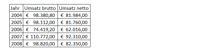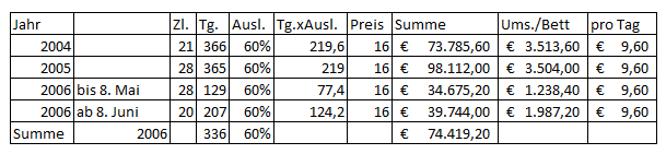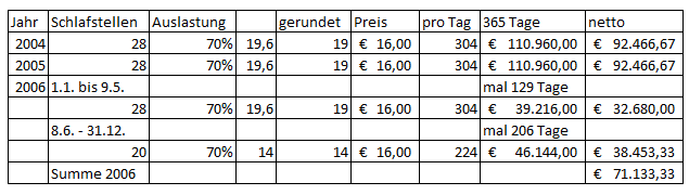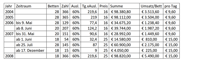 Aufgrund der nunmehr angenommenen niedrigeren Zahl an Schlafstellen von 26 im Jahr 2004, abzüglich fünf für die Familie, ergeben sich für dieses Jahr 21 Schlafstellen, welche im Beherbergungsbetrieb zur Verfügung standen. In Verbindung mit der angenommenen geringeren Auslastung von 60 % ergeben sich folgende Änderungen der Bruttoumsätze:
