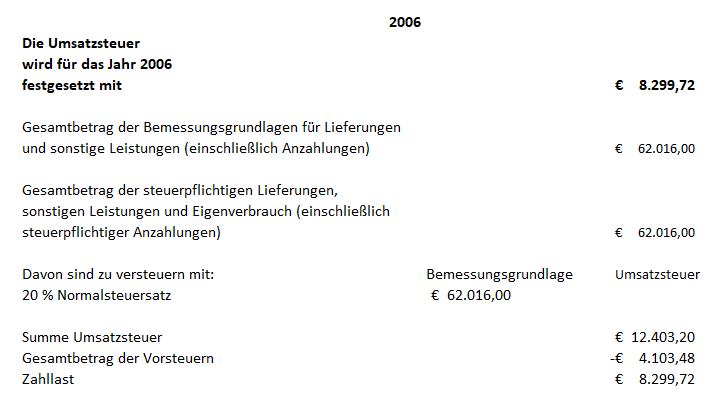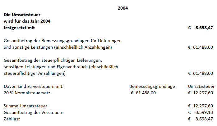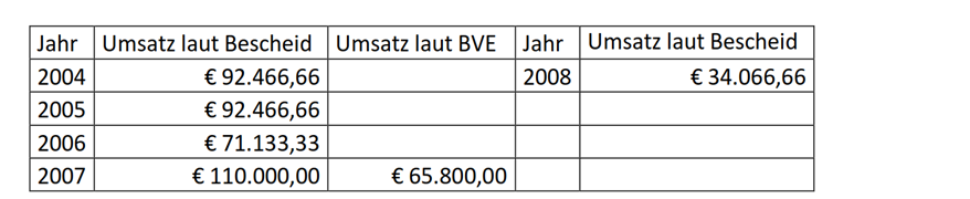 Die Bemessungsgrundlagen und die festgesetzte Umsatzsteuer für die Jahre 2004 bis 2006 betragen daher wie folgt (es werden die Bemessungsgrundlagen und die Umsatzsteuer, die Vorsteuern und die Zahllast aus den im Erkenntnis angeführten Gründen angepasst, wobei auf eine Gegenüberstellung zu den bisherigen Bescheiddaten aus Gründen der Übersichtlichkeit verzichtet wird):