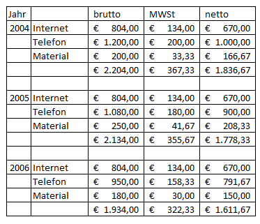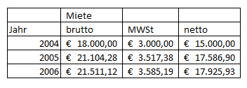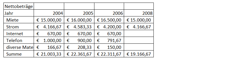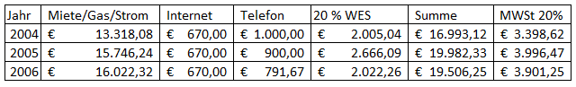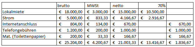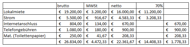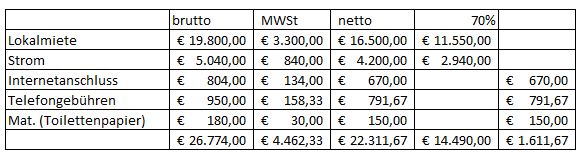 Dem stehen Vorsteuern aus folgenden Netto-Betriebsausgaben gegenüber, wobei bei Miete und Strom bzw. Gas eine Verminderung um den Eigenverbrauch vorgenommen wurde: