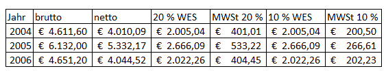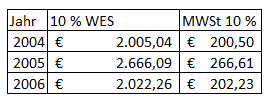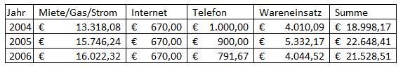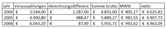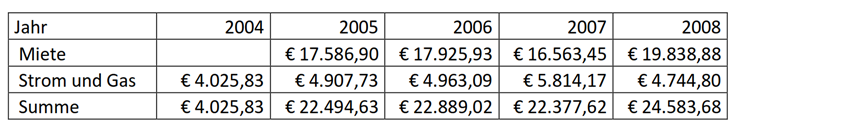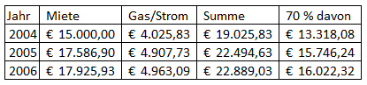 Für 2004 bis 2006 wurden folgende Beträge für Gas und Strom vorgeschrieben, wobei die Abrechnungsdifferenzen gegenüber den Vorauszahlungen des vorangegangenen Jahres jeweils im Februar des Folgejahres abgerechnet wurden, aber wirtschaftlich zum Vorjahr gehören. Einige Tage des neuen Jahres sind jeweils noch in der Abrechnung ausgewiesen. Diese werden mangels anderer Anhaltspunkte aus verfahrensökonomischen Gründen dem jeweiligen Vorjahr zugerechnet (es sind nur einige wenige Tage betroffen, hinsichtlich welcher es dadurch zu einer Verschiebung kommt, eine genaue Berechnung ist ohnehin nicht möglich, weil die Zählerstände nur einmal jährlich abgelesen werden).