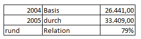 Auch wenn es zu geringfügiger Einbeziehung einzelner Tage des folgenden Jahres kommt, ist deutlich erkennbar, dass es gegenüber 2004 zu einer Erhöhung im Jahr 2005 gekommen ist, jedoch nicht im Verhältnis von 10:28.