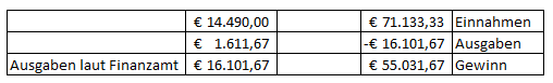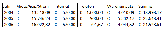 Insgesamt wird daher von folgenden Betriebsausgaben ausgegangen, wobei hinsichtlich Miete, Gas und Strom der vom Finanzamt angesetzte Eigenverbrauch übernommen wird: