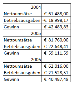 Ausgehend von den geschätzten Nettoumsätzen und den vom Bf. angegebenen Ausgaben errechnete das Finanzamt die Gewinne aus Gewerbebetrieb für die Jahre 2004 bis 2006 wie folgt, wobei es betreffend Lokalmiete und Strom einen Eigenverbrauch von 30 % annahm mit einer daraus folgenden entsprechenden Ausgabenkürzung. Auch die Vorsteuern wurden entsprechend gekürzt. Gegen die Höhe des Eigenverbrauches erhob der Bf. keine konkreten Einwendungen.