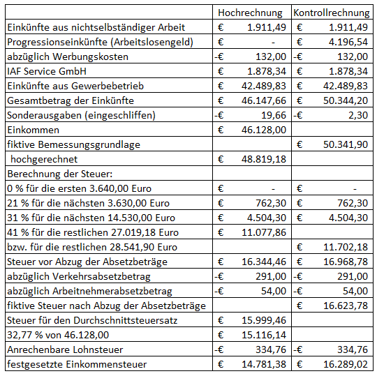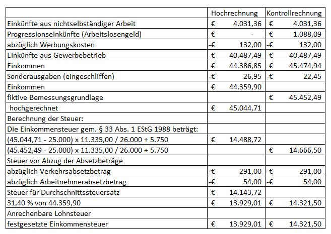 Die Hochrechnung gemäß § 3 Abs. 2 EStG 1988 der außerhalb der Zeiträume des Bezuges von Arbeitslosengeld bezogenen Einkünfte aus unselbständiger Erwerbstätigkeit ist günstiger als die Einbeziehung des Arbeitslosengeldes in die Besteuerung und kommt daher zur Anwendung. Die Kontrollrechnung wird ebenfalls dargestellt. Ganzjährig bezogene Einkünfte sind in die Umrechnung nicht einzubeziehen. Dies trifft auf die Einkünfte aus Gewerbebetrieb zu. Die Berechnung der Einkommensteuer erfolgt nach einem ähnlichen Schema wie in dem Fall, welcher dem Erkenntnis des Verwaltungsgerichtshofes vom 22.11.2006, 2006/15/0084 zugrunde lag.