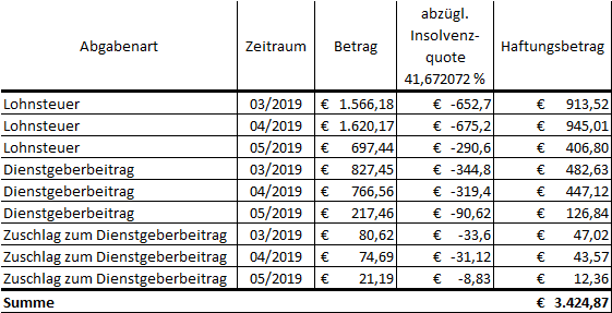 Die Feststellungen gründen sich auf die in Klammer jeweils angeführten Beweismittel und sind im Übrigen auch unstrittig. Dass auch die Forderungen der belangten Behörde mit der im Insolvenzverfahren erzielten Quote zum Zuge kamen, hat die belangte Behörde auf Anfrage des Bundesfinanzgerichtes mit Schreiben vom 29.1.2025 sowie in einem nachfolgenden Telefonat bestätigt. In diesem Telefonat wurde auch eingeräumt, dass die Quotenzahlung aufgrund eines Versehens beim Haftungsbetrag nicht berücksichtigt wurde.