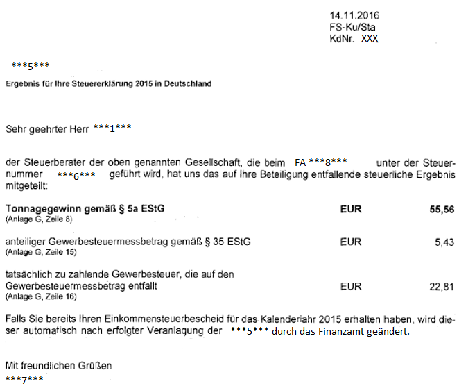 Mit dem Schreiben vom 14.11.2016 wurde der Tonnagegewinn gem. § 5a dEStG für das Jahr 2015 in Höhe von EUR 55,56 bekanntgegeben.