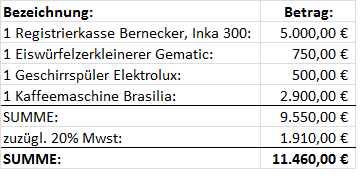 In Zusammenhang mit der entgeltlichen Übertragung des von der Vorbesitzerin mit der "Brau Union" geschlossenen Lieferübereinkommens sowie mit der entgeltlichen Übertragung des Inventars des Geschäftslokals wurden die nachstehenden Beträge wie in Rechnung gestellt: