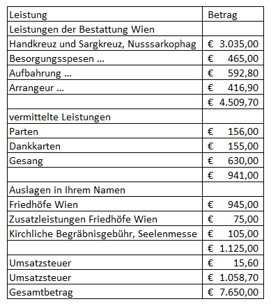 In der Rechnung der Bestattung Wien über 7.650,00 Euro ist ein Betrag für Handkreuz, Sargkreuz, Nusssarkophag in Höhe von 3.035,00 Euro enthalten. Dabei handelt es sich um einen verhältnismäßig teuren Sarg.