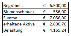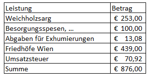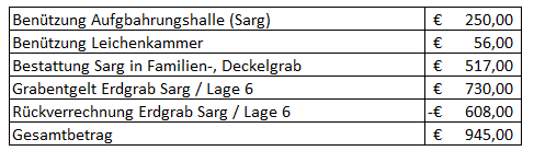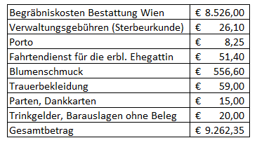 Bei der Todesfallaufnahme wurden folgende Begräbniskosten angeführt: