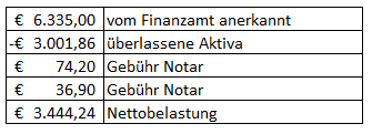 Laut Beschluss des BG FH vom 7.7.2011 wurden Ihnen nach Erklärung der Verlassenschaft als überschuldet die nachträglich hervorgekommenen Aktiven in Höhe von 1.282,47 Euro auf teilweisen Abschlag der getragenen Auslangen anlässlich der Bestattung von restlich 6.666,96 Euro sowie gegen Bezahlung der Forderungen an den Notar in Höhe von 36,90 Euro an Zahlungs Statt überlassen. Weiters war eine Gebühr von 74,20 Euro an den Notar zu entrichten.