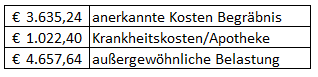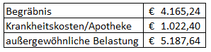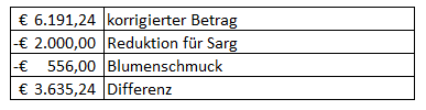 Die tatsächlichen Kosten für das Begräbnis sind anhand der vorgelegten Rechnungen wie folgt nachvollziehbar: