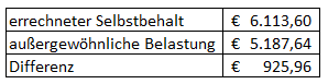 Selbst wenn man zusätzlich zu diesem Betrag noch die von Ihnen für Krankheitskosten und Apotheke geltend gemachten Kosten in Höhe von 1.022,40 Euro berücksichtigt, liegt der Betrag unter dem von Ihrem Steuerberater errechneten Selbstbehalt von 6.113,60 Euro: