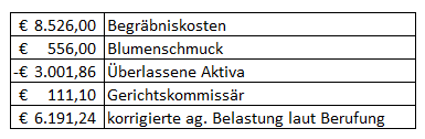 Dabei wurde nicht berücksichtigt, dass die Rechnung der Friedhöfe Wien (1.459,00 Euro) bereits in den mit "Bestattungskosten" bzw. "Exhumierung" bezeichneten Rechnungen erfasst wurde. Der Gesamtbetrag wurde von der Bestattung Wien für Sie ausgelegt und Ihnen anschließend als "Auslagen in Ihrem Namen" weiterverrechnet. Diese Kosten wurden also in der Aufstellung laut Berufung doppelt geltend gemacht.