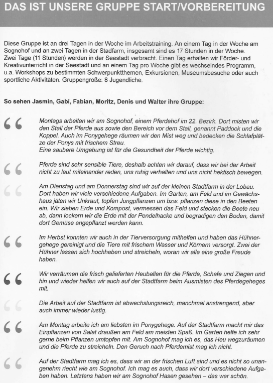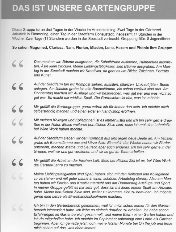 Laut Website von Wien Work (https://www.wienwork.at/de/jugendprojekte/onthejob ) ist Ziel von "On the Job" junge Menschen "auf die Arbeitswelt vorzubereiten. Zum Beispiel auf eine Ausbildung wie eine Lehre oder Teilqualifikation (das heißt, man macht nicht die ganze Lehre, sondern nur Teile davon), auf eine Hilfstätigkeit oder in weitere spezielle Trainingsmaßnahmen". On the Job ist eine Einrichtung der Berufsqualifizierung, die junge Menschen zwischen 15 und 24 Jahren mit Behinderungen betreut. Der Wochenplan sieht drei Tage Arbeitstraining vor, einen Tag Förderunterricht und Kreativpädagogik ("Im Förderunterricht üben wir Deutsch und Mathematik und arbeiten auch am Computer. Wir möchten die Jugendlichen gut auf die Berufsschule vorbereiten und wiederholen das Wissen aus der Schule. Bei der Kreativpädagogik können die Jugendlichen ihre künstlerischen und handwerklichen Talente entwickeln.") und einen Tag sonstige Aktivitäten (Details siehe https://www.wienwork.at/media/file/42_Info_TeilnehmerInnen_On_the_Job_2017-09.pdf ).