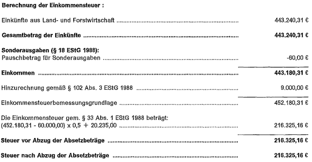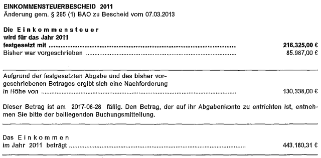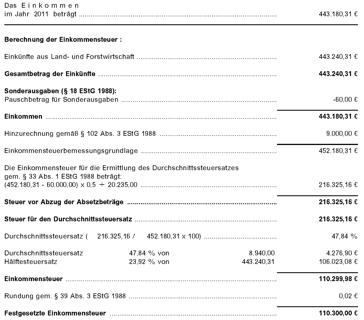 Ausgehend von einem Einkommen von 443.180,31 € im Jahr 2011 wird die Einkommensteuer mit 110.300,00 € festgesetzt: