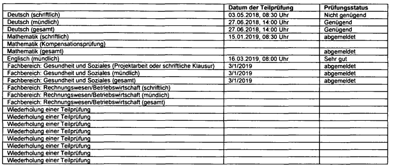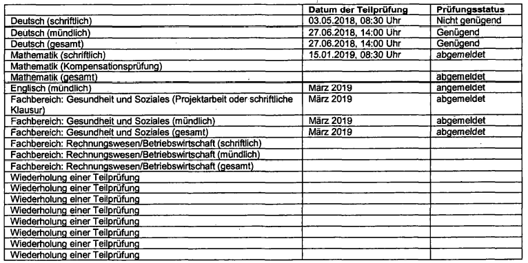 T. hatte Teilprüfungen in Deutsch, Mathematik, einer lebenden Fremdsprache nach Wahl und aus einem Fachgebiet aus der beruflichen Praxis abzulegen.