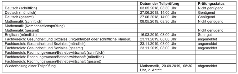 Wie schon festgehalten, hat T. das Fach Deutsch mit 27. Juni 2018 bestanden, ist im Fach Gesundheit und Soziales ist T. im Juni/Juli 2019 nicht angetreten und war für November 2019 zur Prüfung angemeldet. Im Fach Mathematik wurde die Prüfung im Mai 2019 nicht bestanden, zur Nachprüfung im September 2019 ist T. nicht angetreten. Eine Prüfungsanmeldung für Mathematik für Jänner 2020 lag nicht vor.
