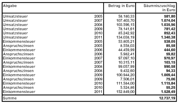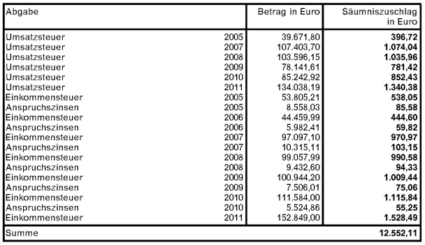 Die in der o.a. Beschwerdevorentscheidung angesprochenen Einkommensteuern 2008, von EUR 7513,36 2009 EUR 17.374,03 2010 EUR 59.819,72 und 2011 EUR 29.706,00 ergeben in Summe EUR 114.413,11.