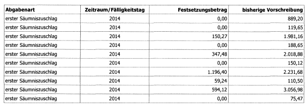 Abgabe | Jahr | Betrag | Säumniszuschlag | BVE | BFG |