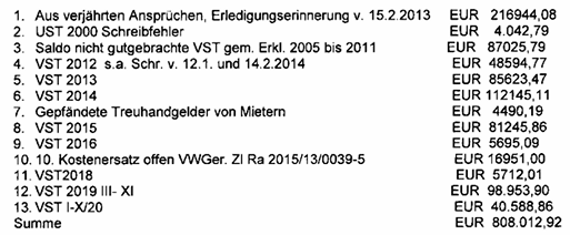 Ein Großteil der (vermeintlichen) Forderungen betrifft Vorsteuerbeträge. Sofern Vorsteuerbeträge strittig sind, dient das Abgabenfestsetzungsverfahren dazu, die strittigen Abgaben/Gutschriften festzusetzen. In Bezug auf den in der Liste angeführten Kostenersatz in Höhe von € 16.951,00 im Zusammenhang mit einem Verfahren vor dem Verwaltungsgerichtshof (ZI Ra 2015/13/0039) ist darauf zu verweisen, dass aus dem zweiten Satz des Spruches der Entscheidung des Verwaltungsgerichtshofs hervorgeht, dass der Bund der Revisionswerberin Aufwendungen in der Höhe von lediglich € 1.346,40 zu ersetzen hat.