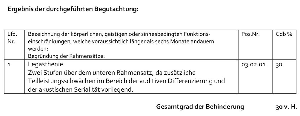 - Legasthenie - Zwei Stufen über dem unteren Rahmensatz, da zusätzliche Teilleistungsschwächen im Bereich der auditiven Differenzierung und der akustischen Serialität vorliegend. / 03.02.01 / 30 %