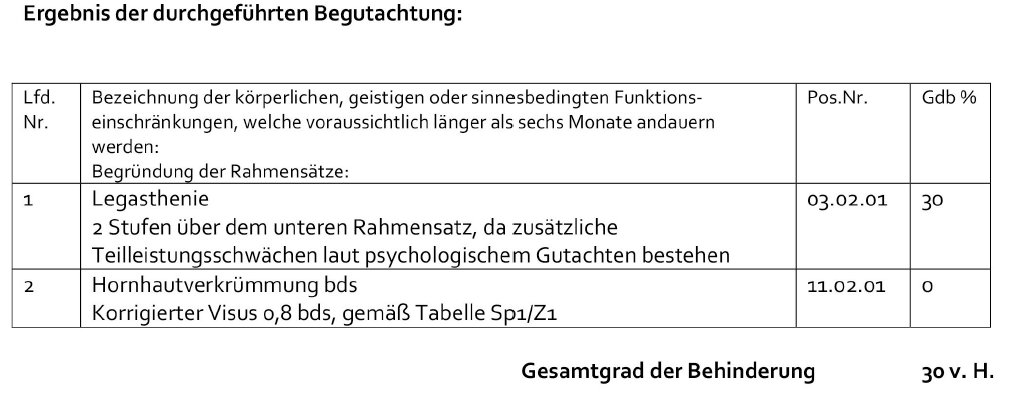 Auch die rückwirkende Feststellung des Grades der Behinderung wurde in beiden Gutachten mit der erstmaligen Diagnosestellung der Legasthenie im Mai 2018 begründet.