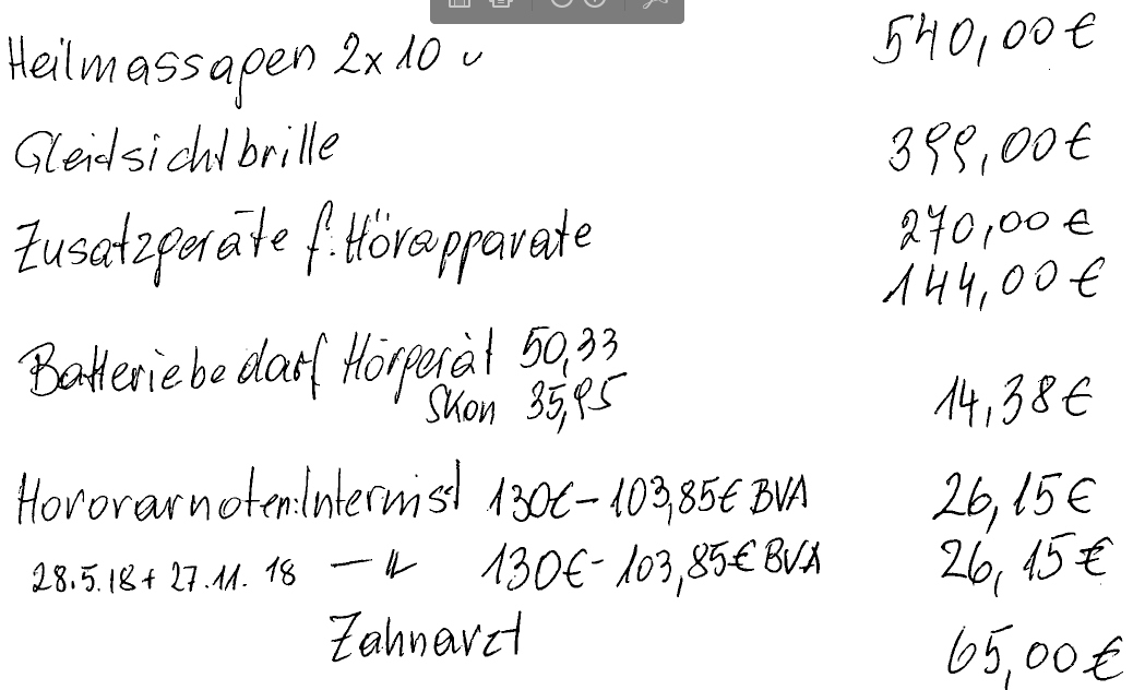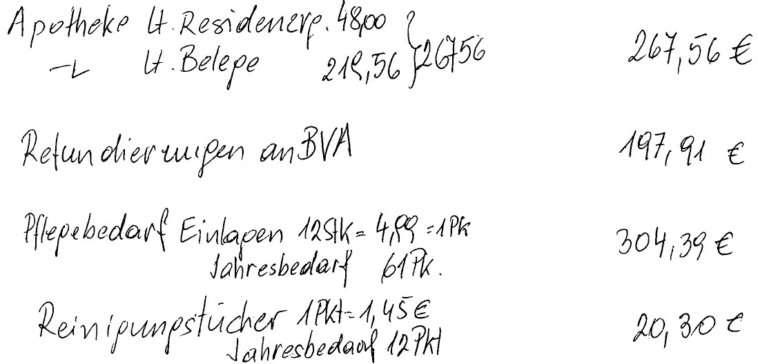 Zwischen der Verwaltung des Alten- und Pflegeheims und der Bf. sind die Residenzgebühr in Höhe von 27.435,36 € und Apothekenkosten in Höhe von 48,00 € verrechnet worden. Über die verrechneten Apothekenkosten hinaus sind dem Finanzamt noch folgende der Bf. in Zusammenhang mit Krankheiten erwachsene Ausgaben für das Streitjahr angezeigt worden: