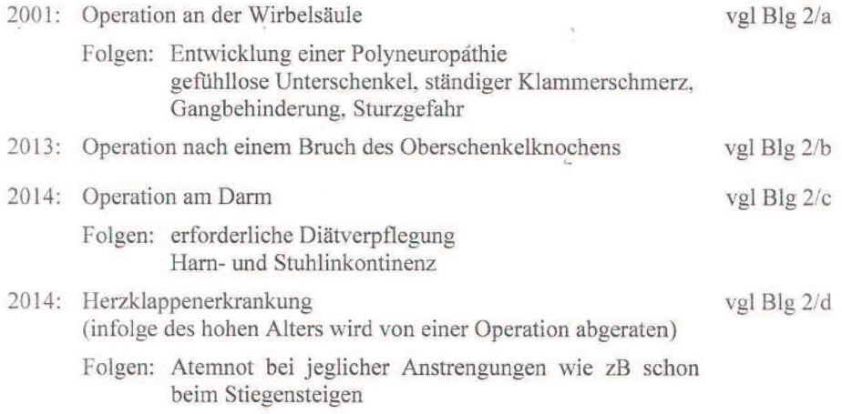 Taubheitsgefühlen in den Beinen (gefühllose Unterschenkel) besteht bei der Bf. eine Gangbehinderung mit Sturzgefahr. Ein tatsächlicher Sturz der Bf. mit Fraktur ist durch die Operation im Landesklinikum Baden-Mödling vom 6.05.2013 dokumentiert.