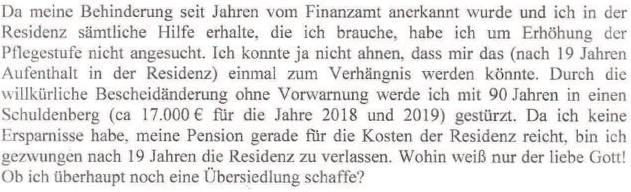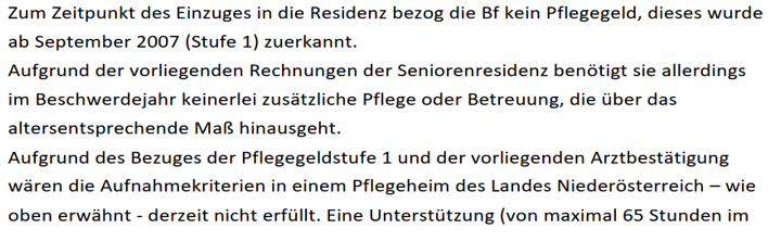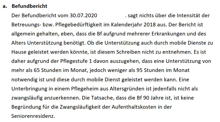 Angesichts des Vorbringens der Amtsvertretung, wonach Behinderte der Pflegestufe 1 im Jahr 2018 in der Regel nicht in ein NÖ Pflege- und Betreuungszentrum aufgenommen wurden, hatte die Bf. aufgrund ihrer durch PNP und das kombinierte Aortenvitium krankheitsbedingten Behinderungen und der Aussage der Hausärztin der Bf. im Befundbericht vom 30.07.2020, wonach "ein Leben ohne Unterstützung aufgrund der beiden Erkrankungen" - PNP, kombinierten Aortenvitium - "nicht möglich erscheint", in Niederösterreich keine andere Möglichkeit, als sich für die Aufnahme in ein privates Pflegeheim zu entscheiden.